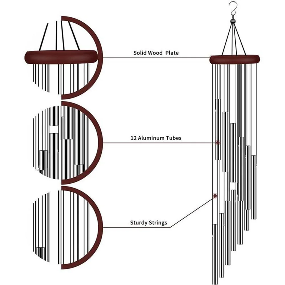 Crisp and pleasant sound: 12 aluminum alloy tubes of different lengths, the sound is more crisp and pleasant than a small wind chime, even the weak wind can make a crisp and pleasant sound.